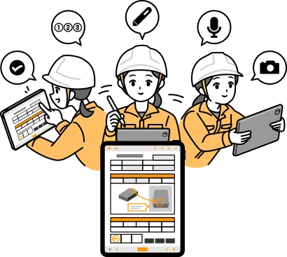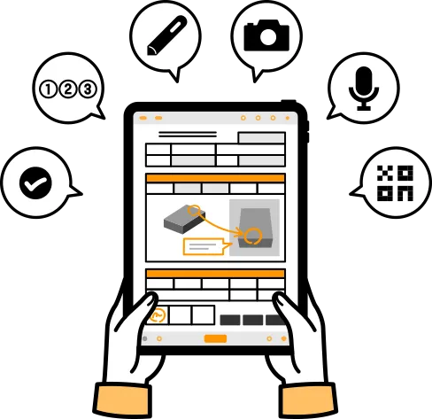 Various input support functions, such as taking photographs, recording audio, reading barcodes, linking to master data, judging thresholds, and specifying the order of work, allow you to collect information about the situation on site accurately and efficiently.
