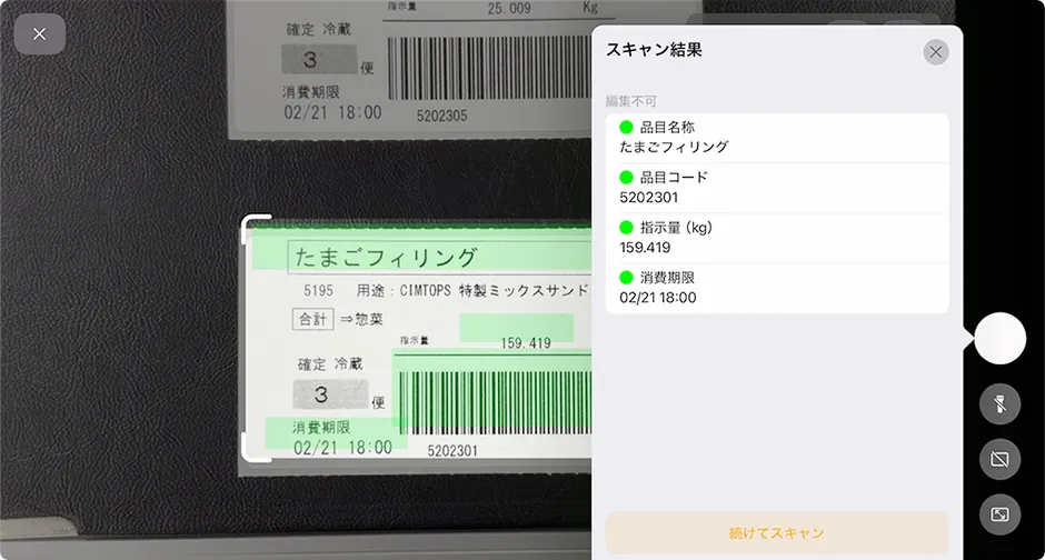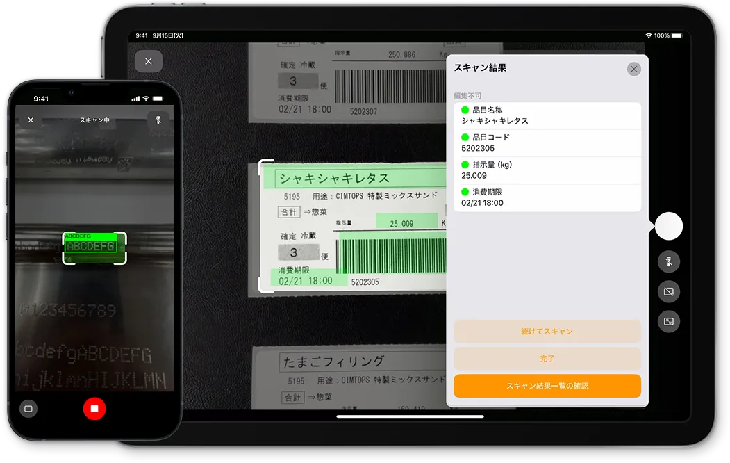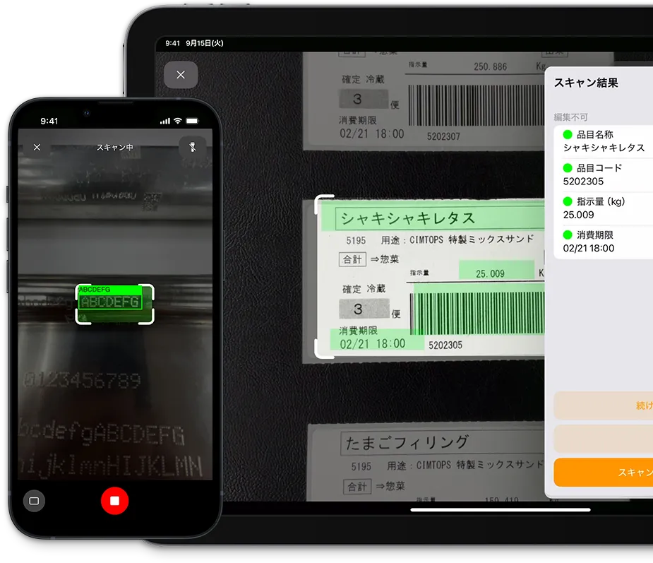 ⽂字情報・⽇付情報・バーコード等を⾼速で読み取り。バーコードとテキストの同時読み取りも可能。 -