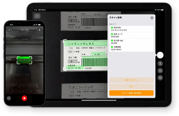 - 最大20件の連続読み、エビデンス画像、最大300分割のバーコード分解で作業を効率化