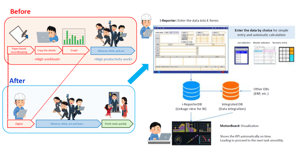 Now, we enter the details in i-Reporter after the maintenance. Based on this report, we use a system called Motionboard to check the number of failures, analysis reports, and the progress of countermeasures.