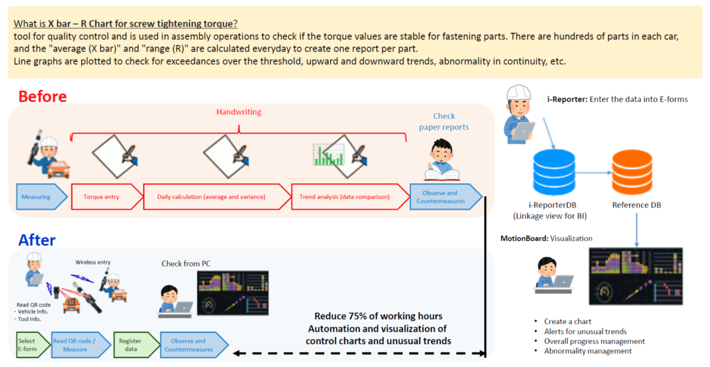 Among them, the deployment of i-Reporter has helped us with the “X-bar R chart ,” which is our management report for the screw tightening torque.