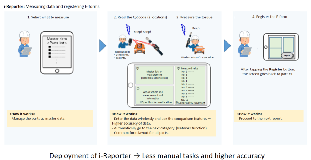 By deploying i-Reporter, we were able to shorten the working hours and eliminate human errors caused by handwritten data. For the added value, we have added a feature that allows us to compare the data, such as “car details, used digital torque wrench, and measured torque,” with our master data. In the end, this feature led to an improvement in product reliability.