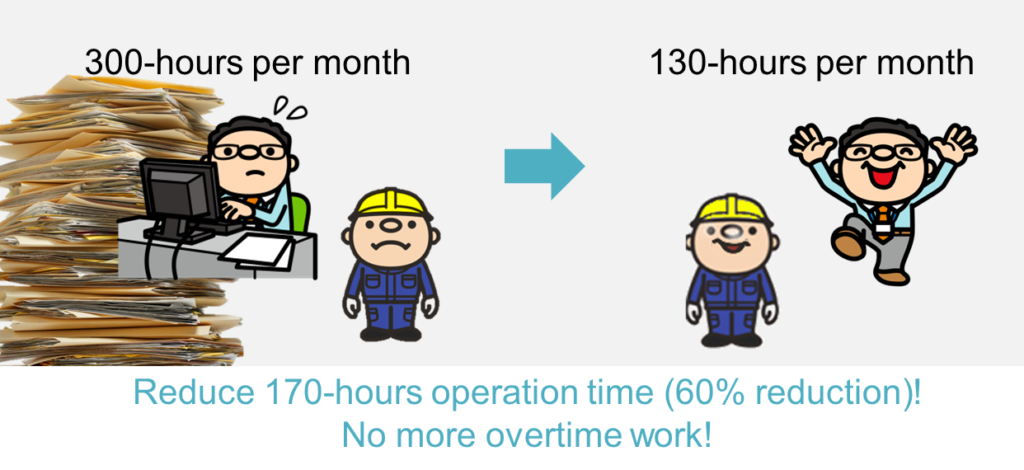Previously in the age of paper and Excel, the staff spent 300 hours per month to create the daily report and for the related administration tasks. However, after i-Reporter, it is 130 hours. 170 hours (60%) have been eliminated.
