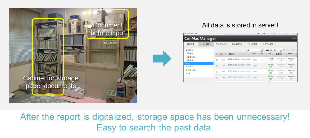 The work of checking for errors and omissions, as well as the task of calculating information by comparing each piece of paper, was eliminated. → Labor costs reduced by approximately 480 hours per month