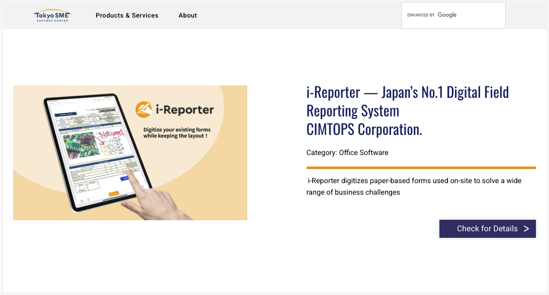 We are pleased to announce that the on-site digital form system i-Reporter has been featured on “Tokyo SME Support Center,” a platform operated by the Tokyo Metropolitan Small and Medium Enterprise Support Center.